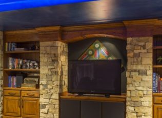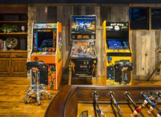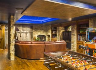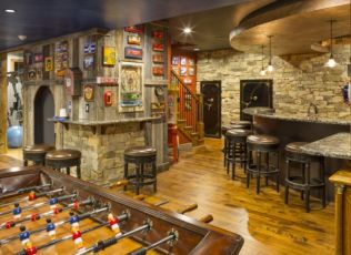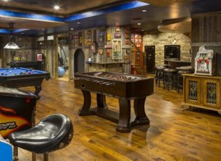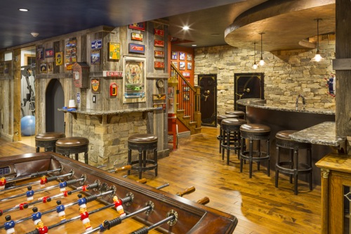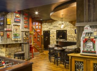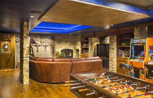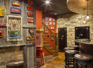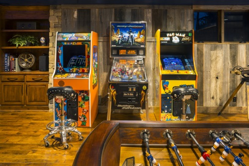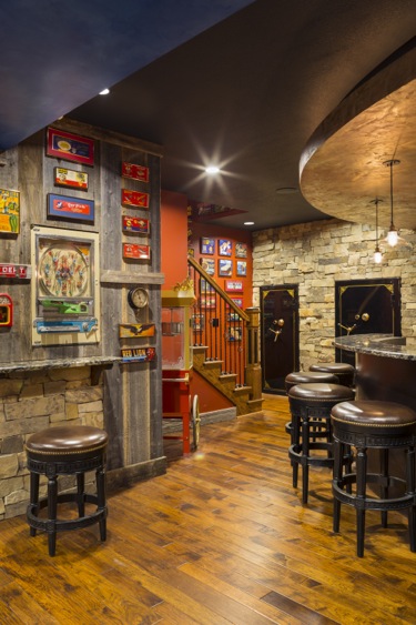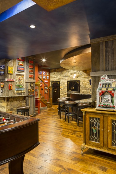 one-of-a-kind Lower Level Finish is rustic, earthy, eclectic, and FUN! With arcade games galore and room for more,