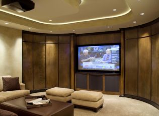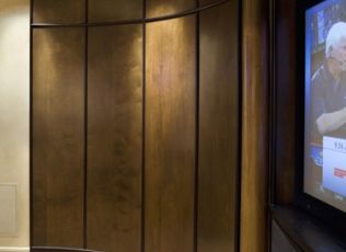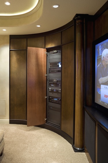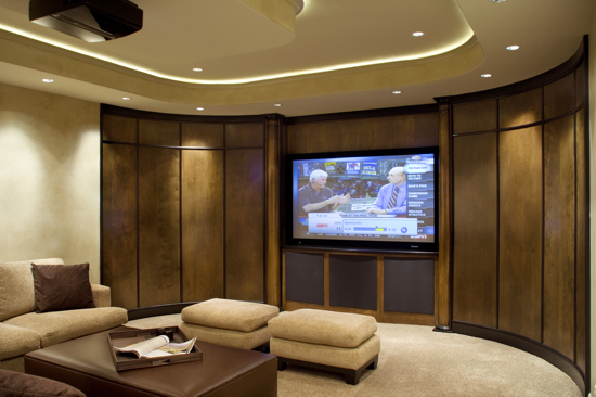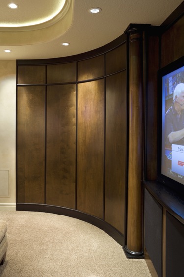 behind one of the theater's custom-built curved wall panels. At the other end of the room, an "S"-shaped