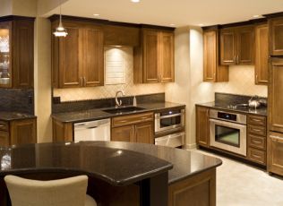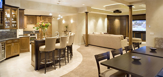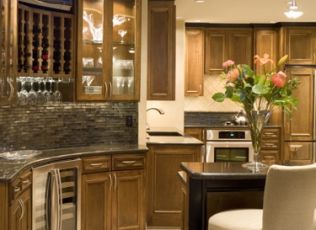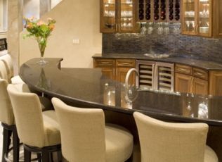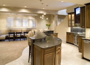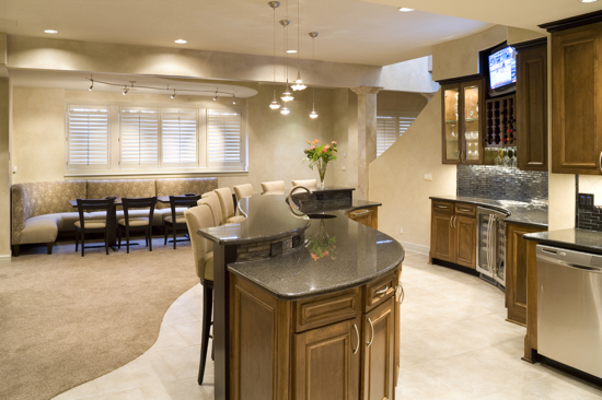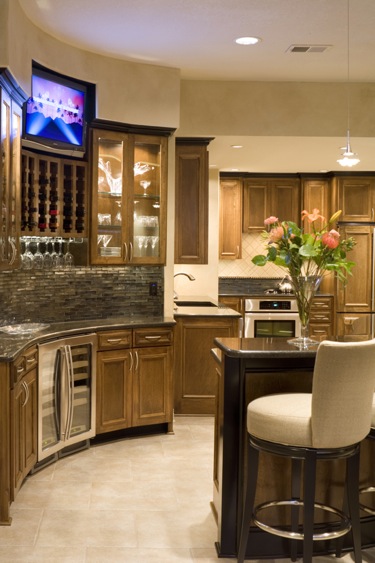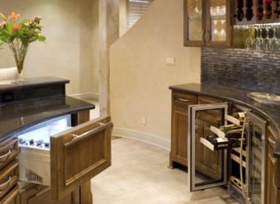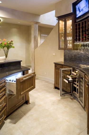 island links a full-function bar to a practical kitchen. Wine coolers, refrigeration drawers, and a