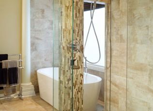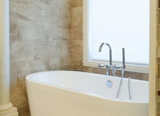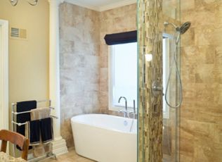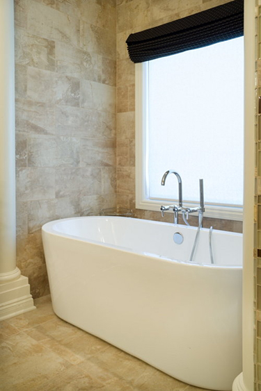 from lots of glass and natural light, and a freestanding tub framed by classic