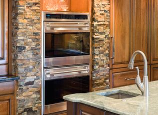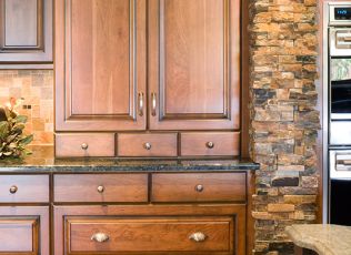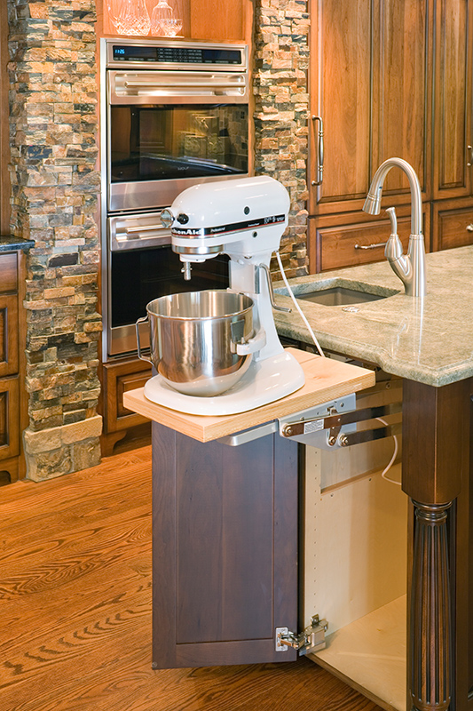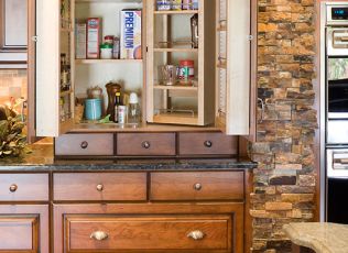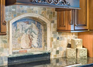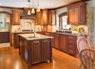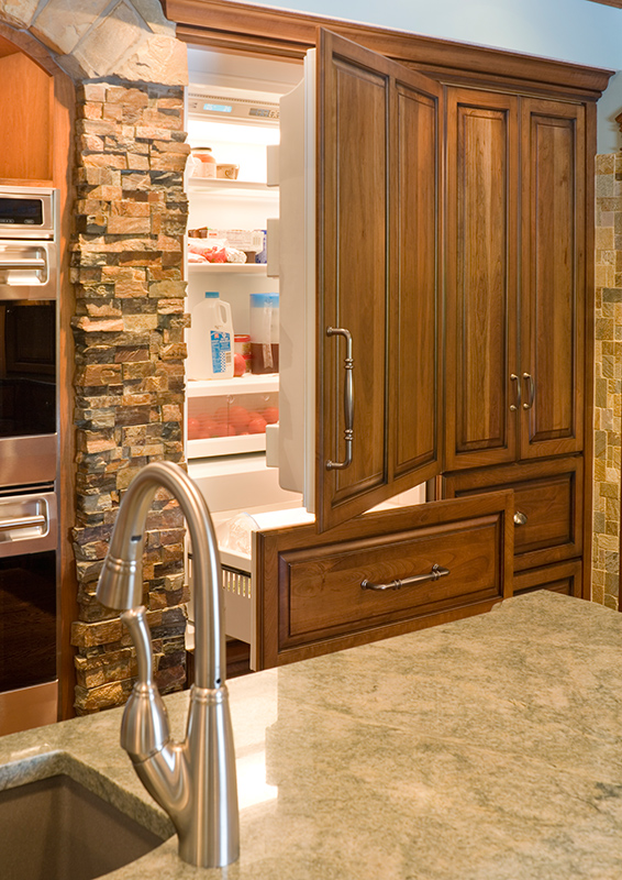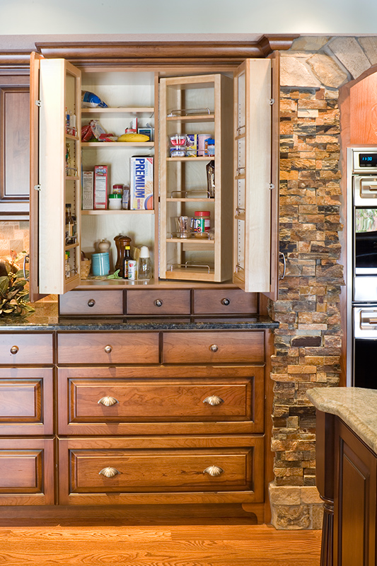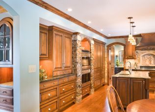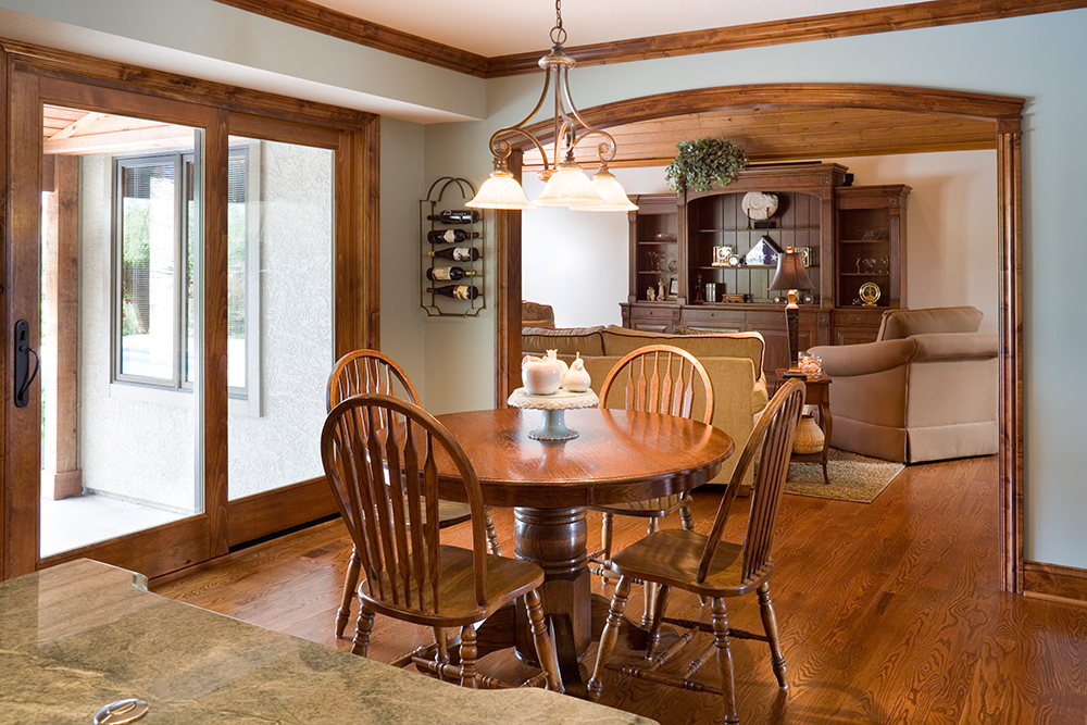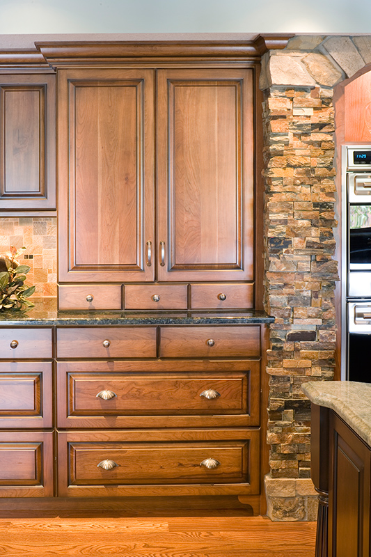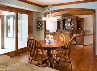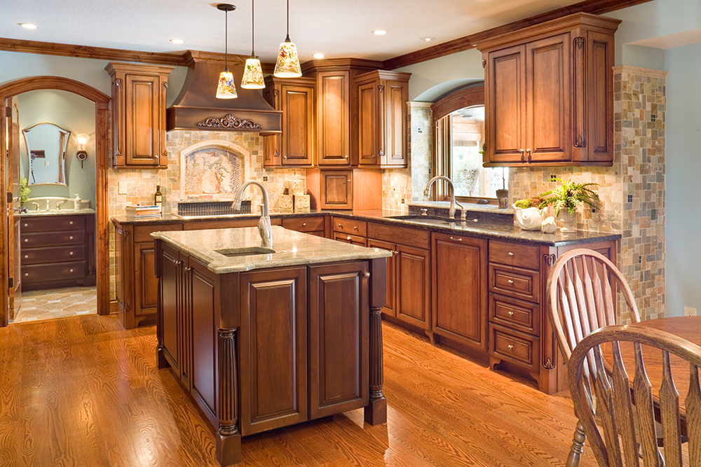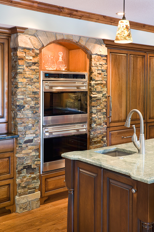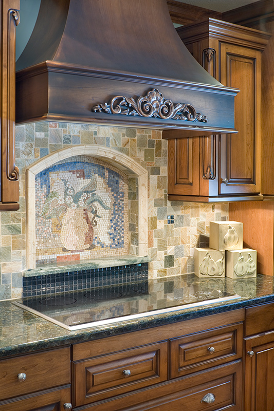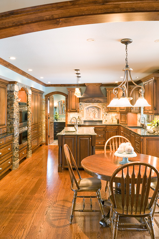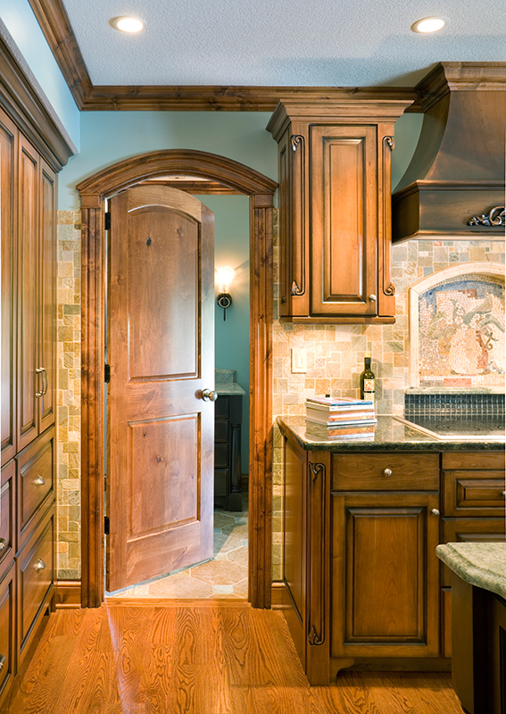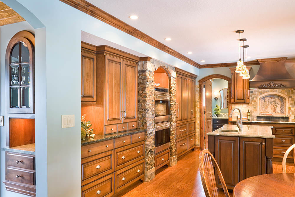 Professionally designed cabinets fill the expanded kitchen. Hand-blown